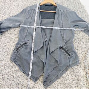 Max Jeans gray open blazer size small denim-like design updates a classic blazer cut with casual appeal, with a draped front to polish the look. Durable fabric ensures lasting wear. Tab sleeves. Gently used condition see photos for measurements and fabric content