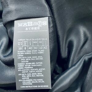 V-neck, long sleeves, buttoned cuffs, zipper closure, no pockets, fully lined. 100% silk