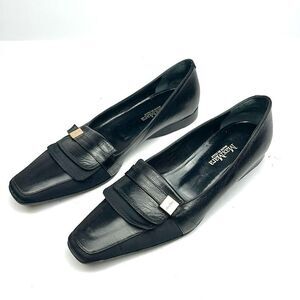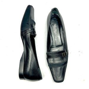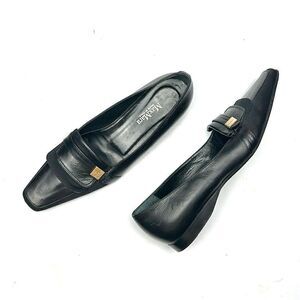 Elegant black leather loafers. Sleek design with a subtle metallic accent. Perfect for versatile styling.