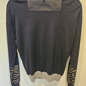 Stylish MaxMara cardigan. Features black and gray stripes. Perfect for layering.