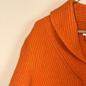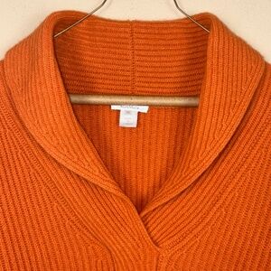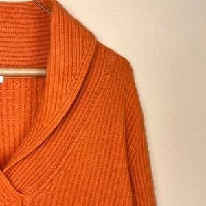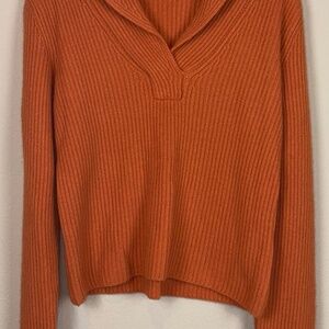 MaxMara Orange Virgin Wool/Cashmere Long Sleeve Ribbed Collared V-Neck Pullover Warm Sweater; Women's Size Medium; When lying flat, measures 19" pit to pit, 23" in length from top of back collar to front bottom hem, and 24.5" in length from top of back collar to back bottom hem; Fabric and Care instructions shown in pictures. Color most representative in lighter colored pictures.