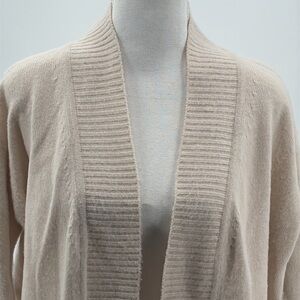MaxMara Pure New Wool Cardigan Sweater in Beige - Size Large (measured). Good pre-owned condition. Missing the belt. You could easily remove the string loops and wear it as an open front cardigan. Not a lot of pilling, per se, but there are standing fibers. Very soft! Ribbed cuffs, neckline and front opening. 100% Pure New Wool. Made in Italy. There was no size tag so please refer to measurements provided to ensure fit. Approximate measurements: 22" pit to pit, 24" length.