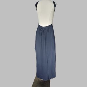Elegant asymmetrical open back jersey rayon dress with side pickup for dramatic draping . Pleated front with a V shaped waist and shoulder straps. In excellent condition. Size 6.