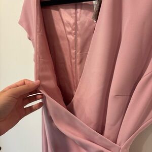 Brand new with tags! This stunning dress can be worn for many occasions. A formal event, wedding, business event. Zipper closure on the back, v neck with faux wrap look. Gathering on the side. Pencil straight fit. Capped sleeves.