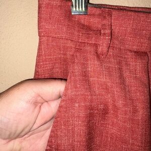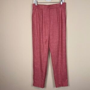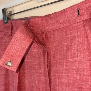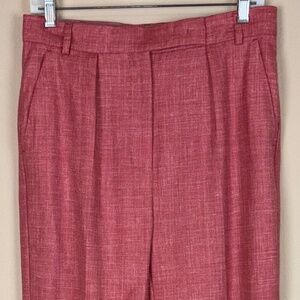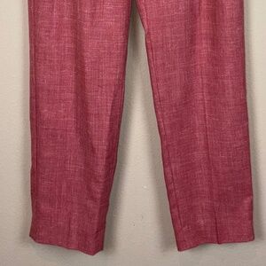 MaxMara Tailleur Sartoriale, Made in Italy, Light Red Alcano Linen Straight Leg Pants with Concealed Button/Hook/Zipper Closure, 2 Front Slant Pockets, 2 Rear Pockets with Button Closure; Size/Fabric/Care instructions Tag Removed (shown in last picture); When lying flat, measures 15.5" waist, 29.5" in-seam, 12.5" rise, and 7.25" bottom pant leg width; Slight darker spot on front right leg towards the center (shown in pictures)