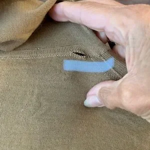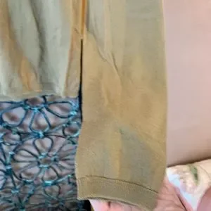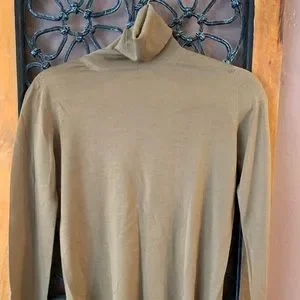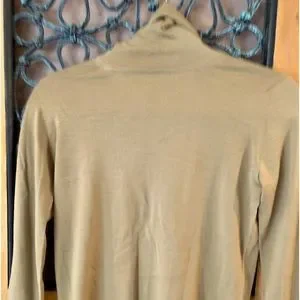 Bought at discount Boutique, I was told this was MaxMara. Tags were taken out. It’s a small, the color is a beautiful Carmel Turtle neck. Nice and light to wear under blazer or on its own. See last photo has a tear at seam line, cannot see once the cowl is folded over. This was also purchased at a discount boutique. A little snug, cleaning out closet.