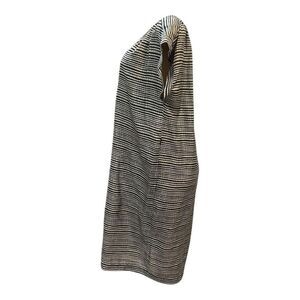 Elegant kaftan dress with black and white stripes. Features a V-neck and short sleeves. Perfect for casual outings or beachwear.