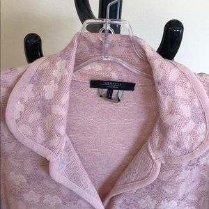 EUC MaxMara Weekend collection jacket. Delicate pink and purple flower knit print with two pockets. Length: 25”, sleeve: 26”, width: 18”.