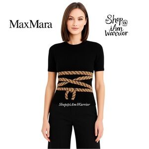 MaxMara RARE cotton knit boatneck short sleeve black sweater in a tan knotted rope motif that goes around the entire sweater thatโs perfect with high waisted trousers for a preppy ensemble. EUC. Not size/material tag, but appear to be a soft cotton & measurements equate to a size small. See all photos.