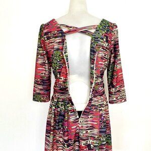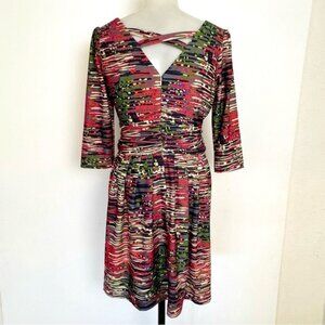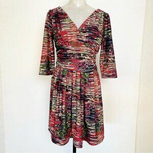 This MaxMara dress showcases a chic fit and flare silhouette with a flattering v-neckline and 3/4 sleeves, pull on style.