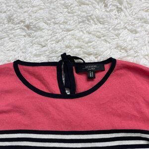 In good condition. Only mark is on the back of the sweater near the wrist in last slide. No other stains, tears, or flaws. Fun black and white stripe. Pop of pink color around shoulders. Tie back. Fun classic sweater.
