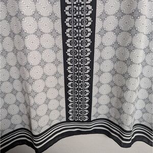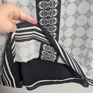 Elevate your wardrobe with this flowy stylish black & white sleeveless top. Perfect dressy or professional occasions, its intricate geometric pattern adds a touch of elegance to your look. Keyhole back neck closure, fully lined in black fabric