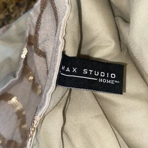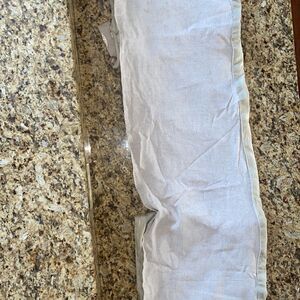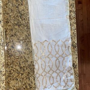 Good preowned condition burlap colored table runner with gold sequin accents.