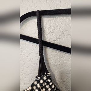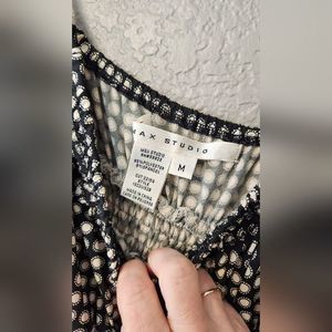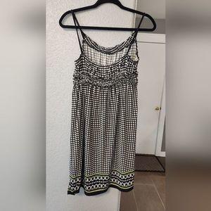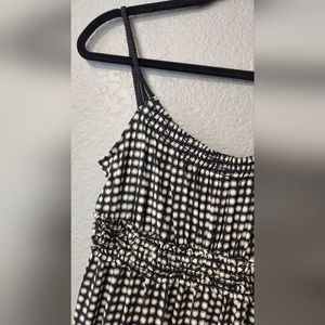 Spaghetti strap dress from Max Studios, with ruffled baby doll waist, accent pattern along the bottom edge.