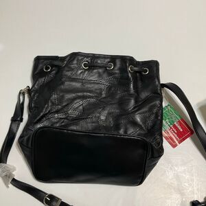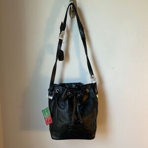 MosaicPatterned Leather Bag by Maxam. Vintage y2k 2003. Deadstock. NWT Black lambskin with adjustable strap and drawstring closure. Silver hardware. Perfect black satin lining with inside zip pocket. 9”x5” base 13” W. 11” L. Hobo Bucket Bag. Super soft!