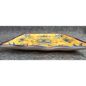 This vibrant hand-painted Talavera-style ceramic plate features a yellow base with intricate floral designs in blue, green, and red. Measuring approximately 11.5 x 11.5 inches, its square shape and subtle wavy edges add a unique touch to its artistic appeal. Made with durable ceramic material, it serves as a decorative piece for any space.