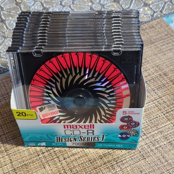 Maxell CD-R Design Series with vibrant red and black design. 14 pack for 700 MB storage. everything pictured is what is included. 14 are included from the original 20 pack. see photos for more details.