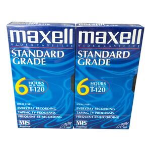 Maxell Video Cassette Standard Grade 6 Hours T-120 Blank VHS Tape 2 New Tapes. Sealed as shown.