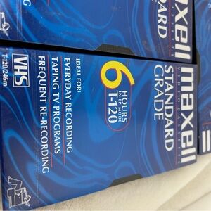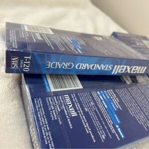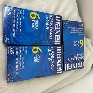 Maxell Video Cassette VHS T-120 6HRS Tapes NWT 3PC Bundle. Standard grade. Pack of three tapes in unopened packaging. New with tags.