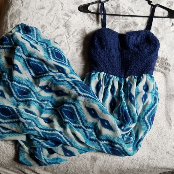 Super gorgeous navy blue top maxi with an abstract blue and white print down the length. Banded below bust line for flattering fit. NEVER WORN. back has a slit at the bottom for ease of movement. Top is lace detailed. Bust lightly padded.