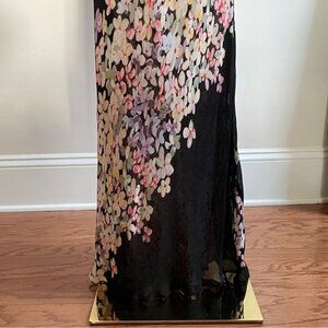 Beautiful and unique reversible chiffon maxi skirt. One side features a black base with cascading pink and ivory florals, while the reverse has a soft pastel floral print. Lightweight and flowy with a whimsical, boho vibe.