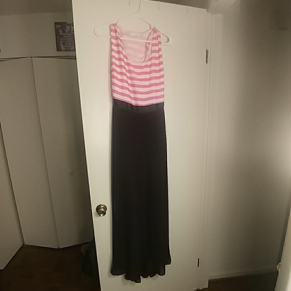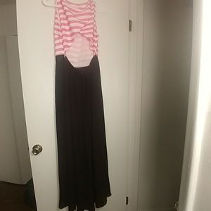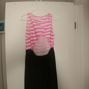 Bright pink and white striped top, black bottom. Open back. Light weight material. Tags are off, but never was worn.
