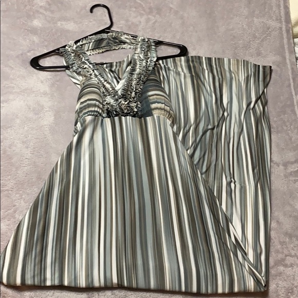 This maxi dress would be a perfect addition to your closet. It is an older dress, worn a few times, but high quality material that is soft and flows. It is multi colored, with hints of light blue, different variations of light brown and cream.