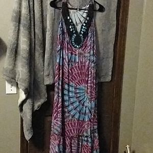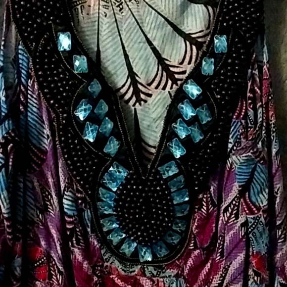 Gorgeous gems dot the v-neck on this beautiful dress! So versatile to use dressed up, or barefoot and casual! Colors are very vibrant