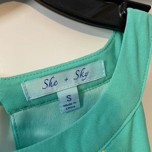 Worn once. No stains. Does have a few light snags as shown in pictures. Has an under skirt. Tan, yellow, and aquamarine. Pleated skirt. Keyhole front and back. Smoke free home!