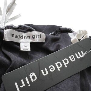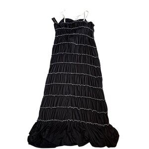 Madden Girl tiered maxi dress, black with white contrast trim, ruffles, bows all the way down, scoop neck, sleeveless, adjustable straps, stretchy, lined, large, pit to pit: 19", length: 60", new with tags