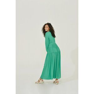 From the floating bishop sleeves, with their intricate tailor-made stretch cuffs, to the dramatic, lightly gathered dress tiers that look picture perfect in the breeze, this is one of the most complimented pieces in the collection. This button-up emerald green maxi dress is free from harmful chemicals and dip-dyed for an earth-friendly addition to your fashion essential’s wardrobe.