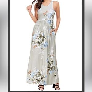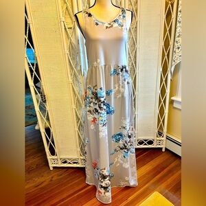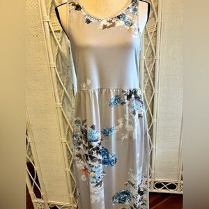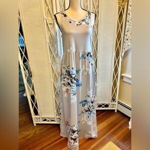 Maxi Dress Grey with Blue Pink White Flowers Round Neck Pockets size Large