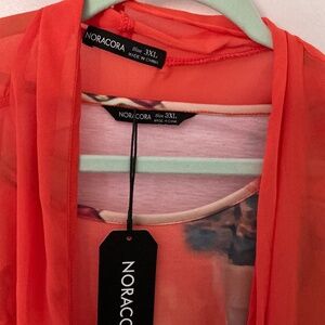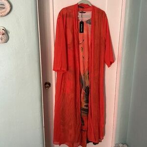 • Kimono: Lightweight sheer fabric in a bright coral hue, open front, 3/4 sleeves