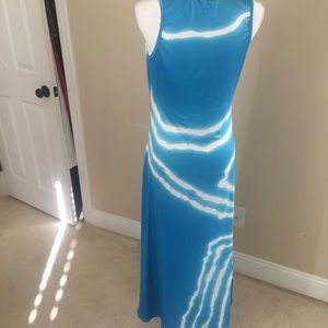 This Is a maxi some address that is powder blue and white. This dress material is a nylon and cotton blend. This dress will fit sizes small to medium