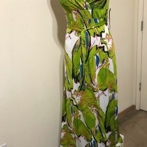 Women’s maxi dress with beaded adjustable straps and belt. Bright lime green with white, black, fushica blue and yellow. 95% polyester and 5% spandex. Machine wag cold, tumble dry. Bust: 34; Waist: 28; and Length: 48. NWT