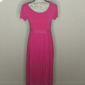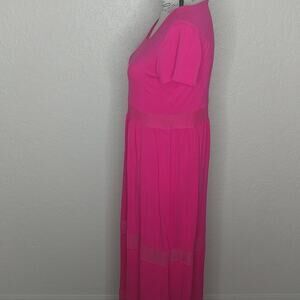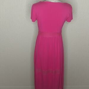 Pink short sleeve maxi dress with see through mesh panels. No size tag. Please see approximate measurements below.