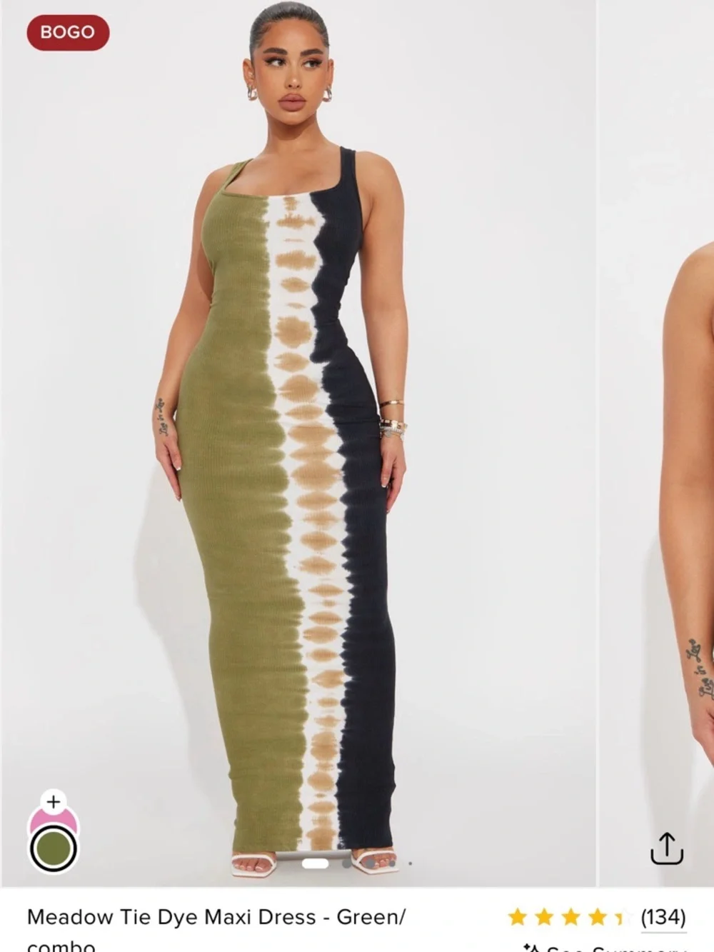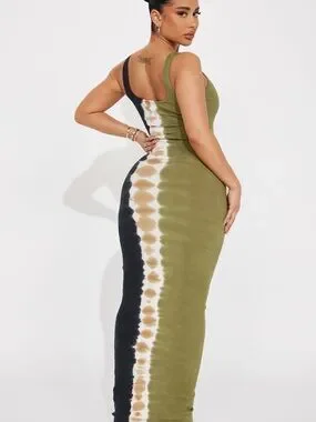 Sleeveless ribbed maxi with a striking vertical tie-dye stripe. Square neckline and bodycon fit. Sleek, curve-defining silhouette. Easy to dress up or down.