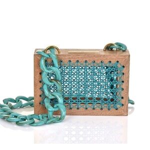 Excellent condition. Stylish wooden mini bag. Features teal chain and intricate design.