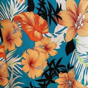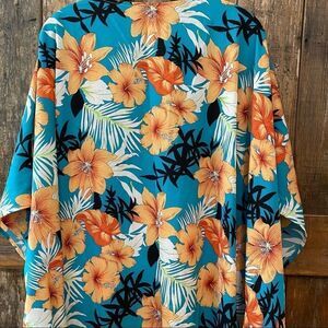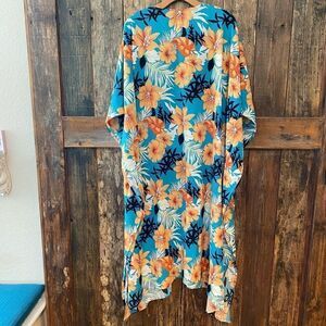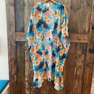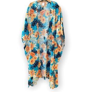 Maxi S Hawaiian Kimono Teal Orange Hibiscus Flowers Oversized Flowy BOHO Vibe