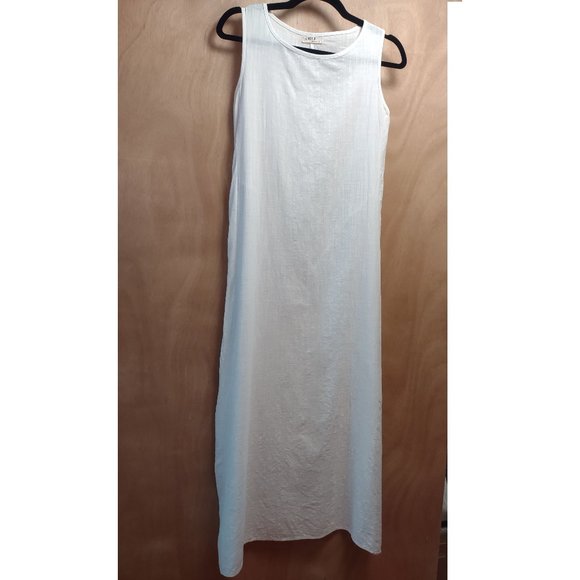 Simple, elegant, summery dress, fitted at top with slim A-line bottom. Medium weight structured cotton/linen feel. Perfect for a day at the beach.
