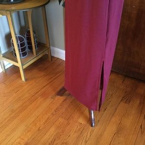 Colors are black and burgundy. Both sides of the skirt have 14" slits. Waist is 14 1/2 inches across when unstretched. Over all length is 40 inches. 71% polyester, 24% rayon, 5% spandex.