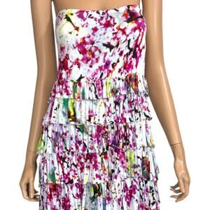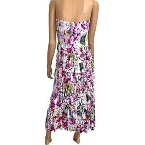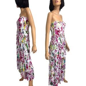 A flouncy maxi skirt that doubles as a strapless dress. Multi-tiered ruffle layers, colorful tie dye, pull-on with elastic waist, stretchy jersey knit t-shirt type fabric. Fun, comfortable, and effortless. Great travel piece and perfect for casual vacation resort wear. Grace Elements, Tag Size M. *Mannequin is XS.