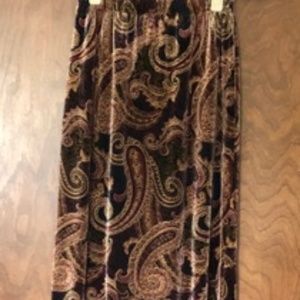 Rich Velvet Burnout Maxi Skirt in lightweight fabric -Beautiful Colors with splashes of gorgeous shades of brown, purple, maroon and tan depending on how the light touches it. The bottom back plumes out with additional fabric giving the skirt detail and character. Comfortable pull on elastic waistband-