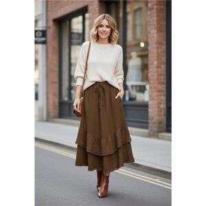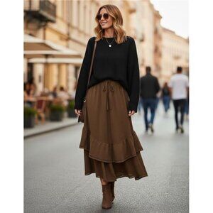 Features - This long maxi skirt is designed with two layers of ruffles, a high-waisted cut, and an adjustable drawstring waistband. It comes in a solid color and features two functional side pockets for practical use. The curved hem adds to its flowing, elegant look