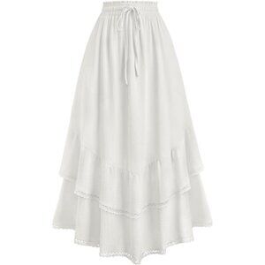 Features - This long maxi skirt is designed with two layers of ruffles, a high-waisted cut, and an adjustable drawstring waistband. It comes in a solid color and features two functional side pockets for practical use. The curved hem adds to its flowing, elegant look