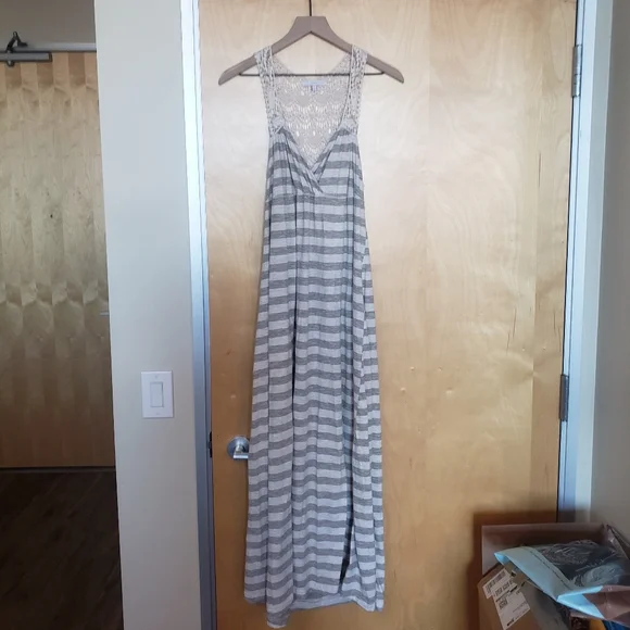 grey and white stripped dress with knitted lace accents, 65%cotton 35%poly