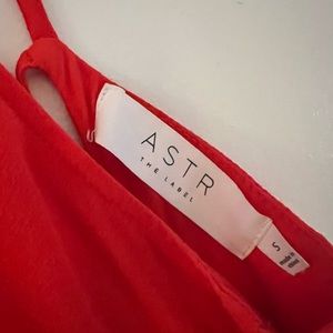 Maxi dress, comes to above ankle, orangy-red, high neck with lace.