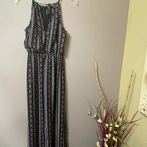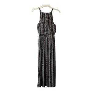 Maxi dress, drawstring tie neck, semi racerback keyhole opening in back. Elastic empire waist, side slits to knees, with lining to knees. Black with pink, white and turquoise print. southwest geometric diamond shapes in vertical pattern. Size small. 100% polyester. Good prion condition.