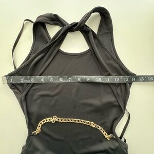 A cute and simple yet very sexy maxi dress will low open back, sleeveless. Has an attached gold chain belt in the front which can be taken off if you like. The dress is fully lined and it has a very soft material. Easy to pack for trips.