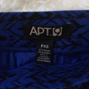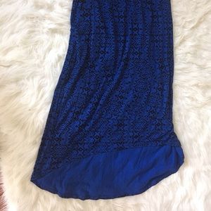 Blue skirt with black print maxi skirt. High low feature (great for showcasing shoes) at bottom, while still remaining a maxi